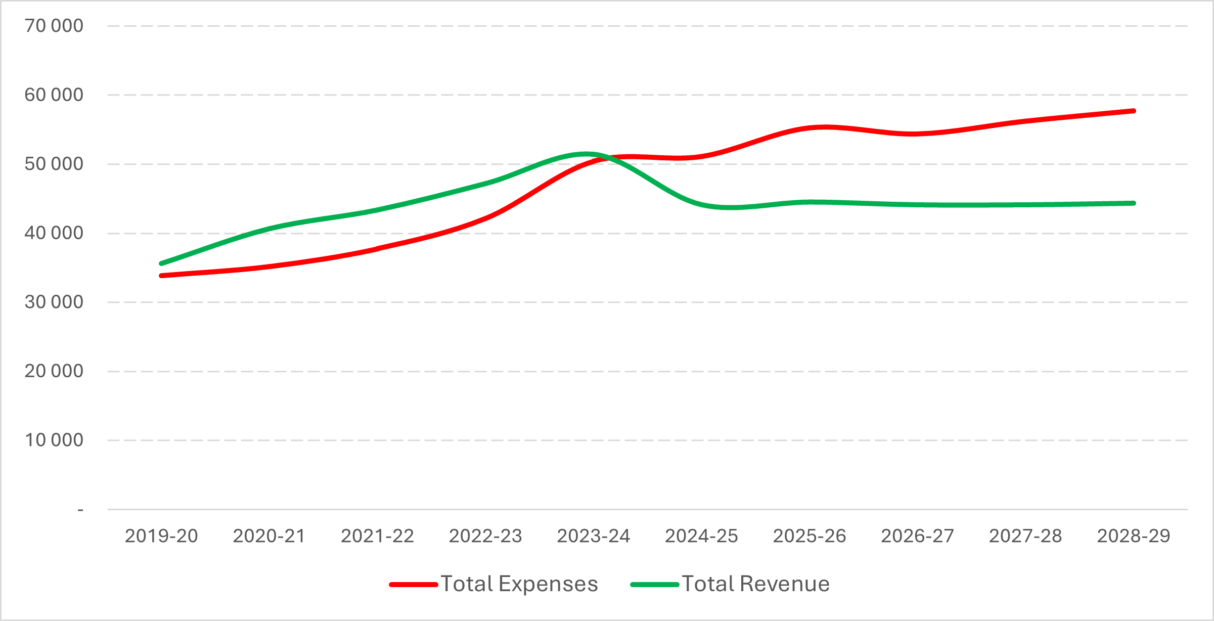 We project a series of operating deficits for FY 2024–25 through to FY 2027–28. The deficits are the result of inflationary pressures and flat revenue forecasts. This would be our first operating deficit since 2018–19.