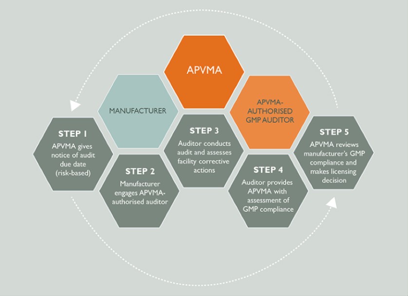Figure 1 outlines the various steps in the GMP audit cycle and the roles of manufacturers, auditors and the APVMA.